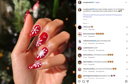 El rojo es la base perfecta para muchos diseños, y si hay un símbolo que relacionamos con la Navidad, esos son los copos de nieve. Un clásico que a la vez puede ser moderno, como esta manicura de uñas rojas y copos blancos que es sumamente atractiva. Aunque también tenemos la opción intercambiar las tonalidades y jugar con los contrastes.