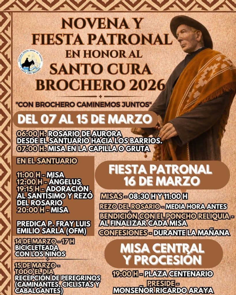 Durante estos días, fieles, peregrinos y visitantes de distintos puntos del país llegarán a la localidad para participar de una intensa agenda espiritual y cultural que tendrá como epicentro el Santuario Nuestra Señora del Tránsito, el Museo Brocheriano y la Plaza Centenario, espacios profundamente ligados a la vida y obra del llamado “Cura Gaucho”, figura clave en la historia social y religiosa de Traslasierra.